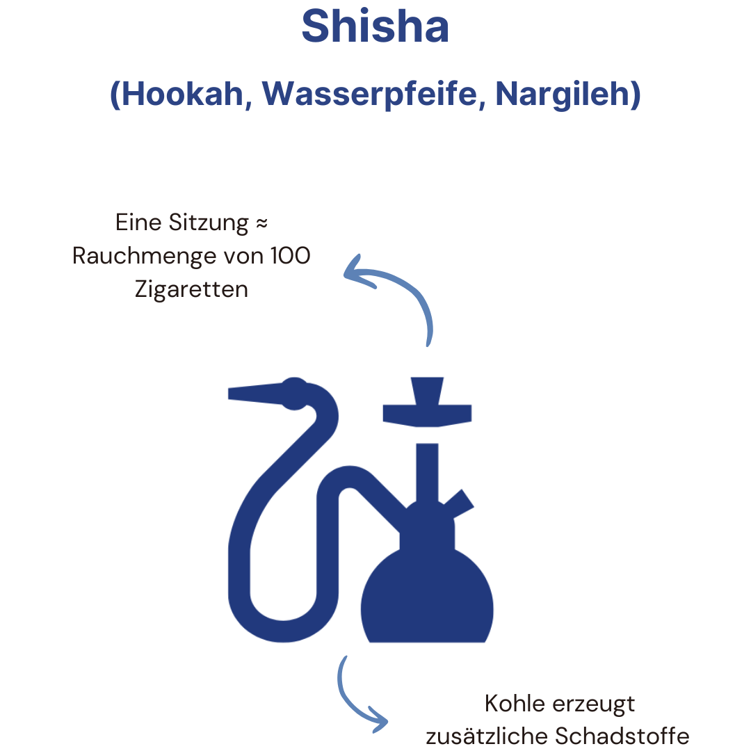 Die Shisha wird oft als mildere Alternative zur Zigarette dargestellt – doch dieser Eindruck täuscht. Sie birgt mindestens ebenso hohe, teilweise noch grössere Gesundheitsgefahren – sowohl für die Konsumierenden als auch für alle in ihrer Umgebung. Entgegen der verbreiteten Meinung filtert das Wasser den Rauch nicht effektiv. Der Shisha-Rauch enthält viele Schadstoffe, darunter Kohlenmonoxid, Feinstaub, Teer, Schwermetalle und krebserregende Stoffe wie PAK.