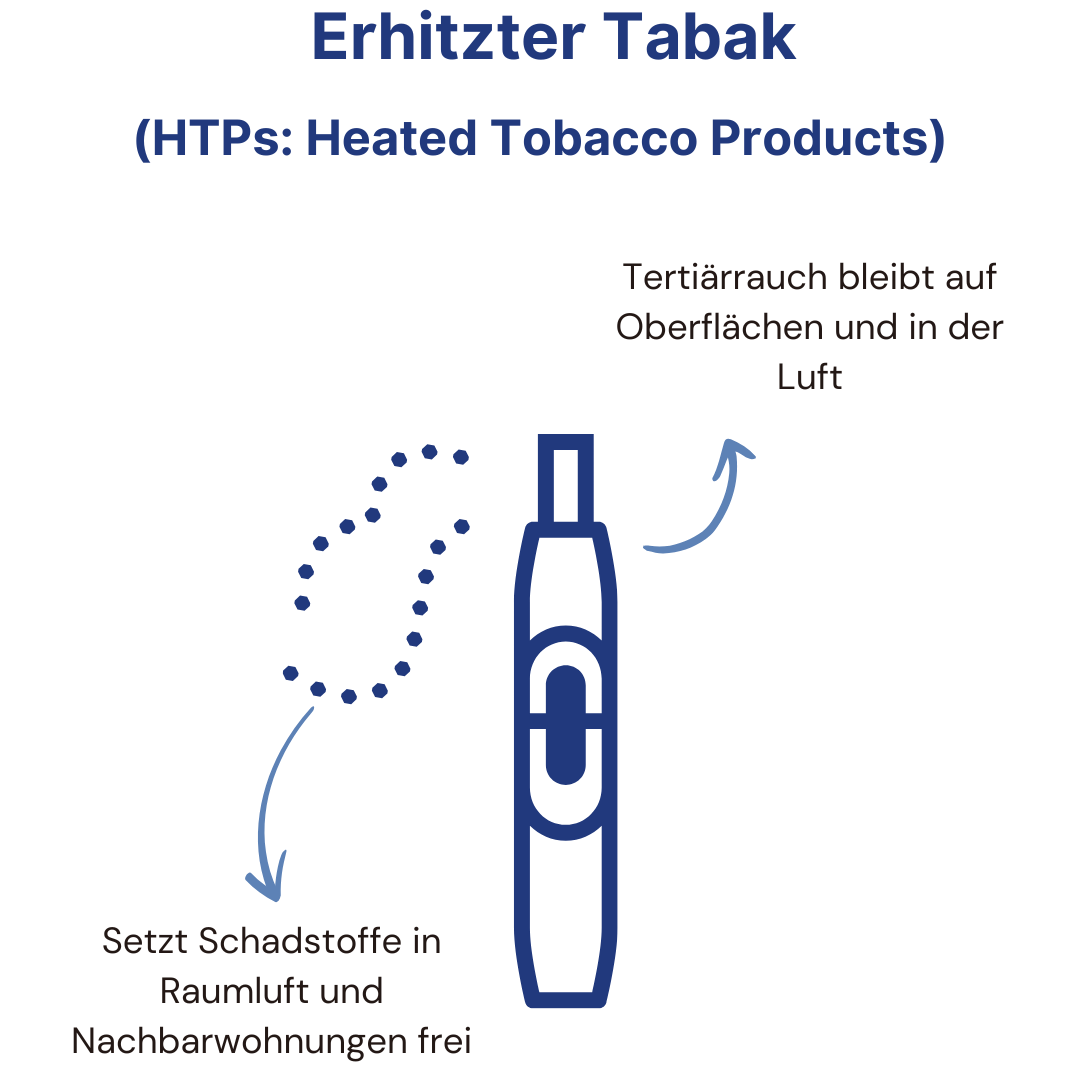 Wer sich in der Nähe einer Person aufhält, die erhitzten Tabak konsumiert, ist dem Rauch ausgesetzt. Die Emissionen können auch in Nachbarwohnungen eindringen (z. B. durch Lüftungsschächte, dünne Wände, offene Fenster), in der Luft schweben oder sich auf Oberflächen ablagern – das nennt man Tertiärrauch.