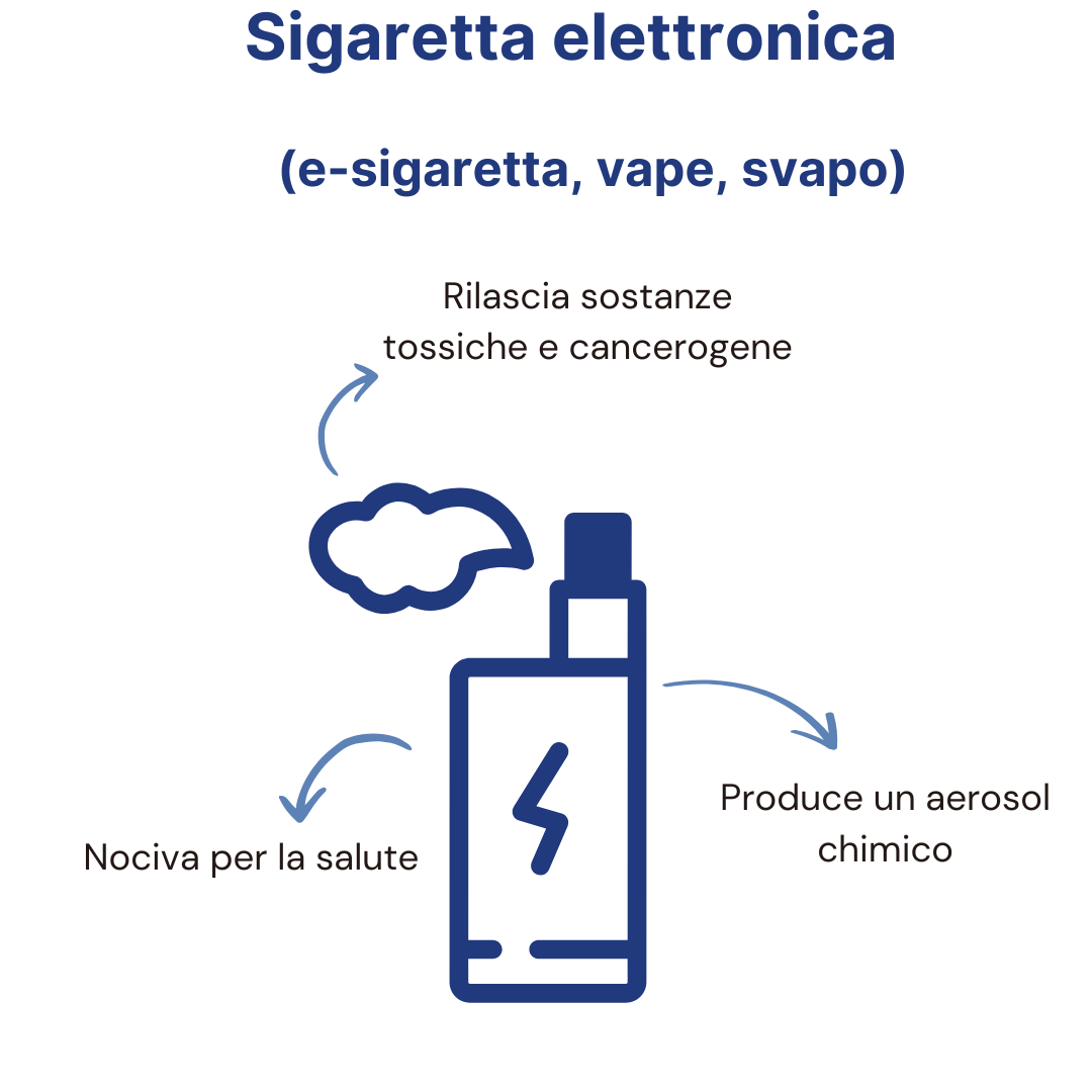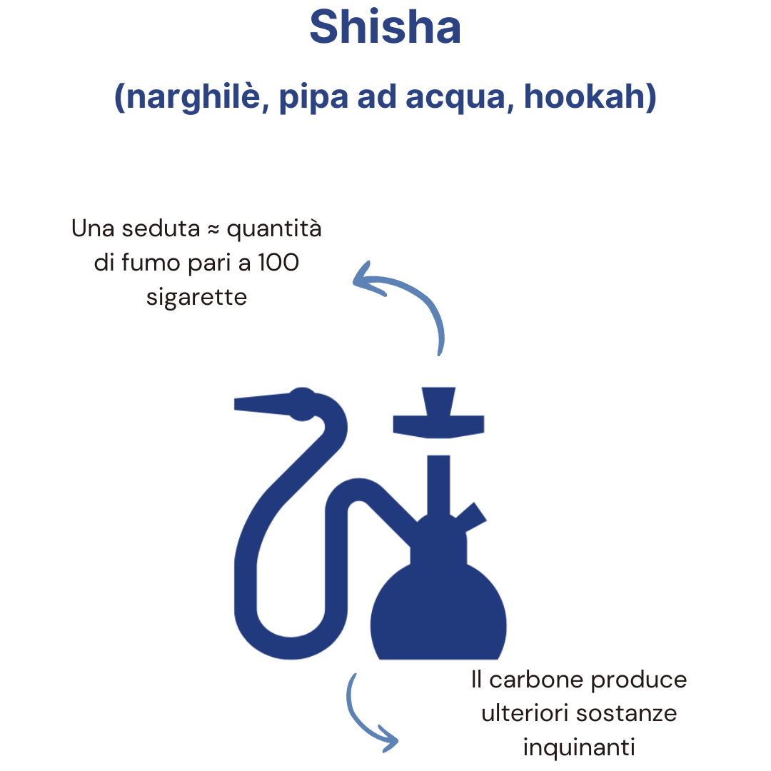 Lo svapo passivo, il tabacco riscaldato e la shisha (detta anche narghilé o pipa ad acqua): rilasciano tutti sostanze nocive che possono essere inalate dalle persone presenti, anche senza consumo diretto. Le sigarette elettroniche emettono nell’aria particelle ultrafini e composti tossici. Il tabacco riscaldato produce a tutti gli effetti fumo contenente sostanze irritanti o cancerogene. Anche la shisha espone chi sta intorno a un fumo denso e pericoloso, talvolta in quantità equivalenti a un centinaio di sigarette per una sola sessione.