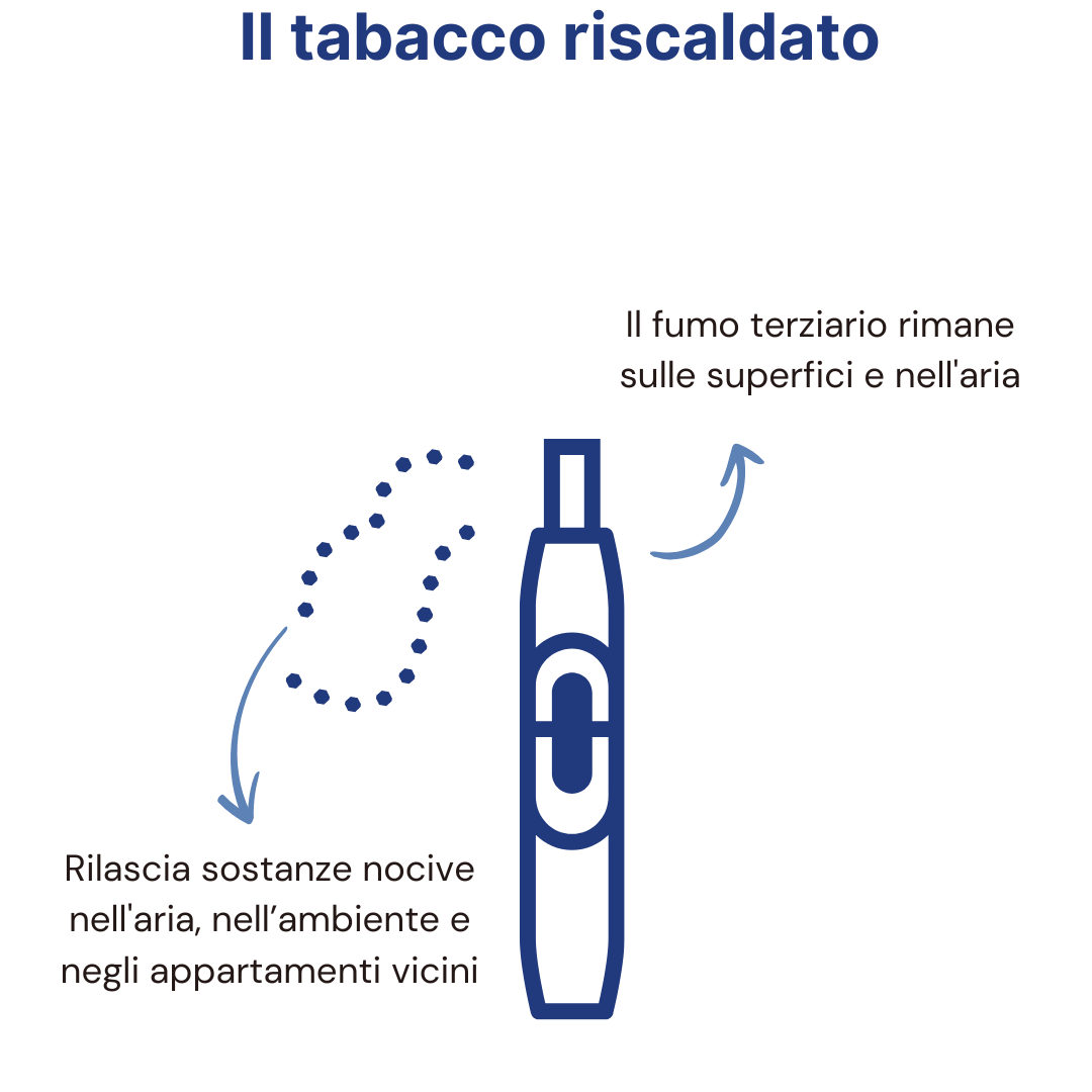 Pertanto, ciò che inala chi si trova vicino a un fumatore di IQOS o di prodotti simili è effettivamente fumo. Queste emissioni possono infiltrarsi negli appartamenti vicini (tramite prese d’aria, pareti sottili, finestre aperte), rimanere sospese nell’aria o depositarsi sulle superfici (ciò che si chiama fumo terziario).