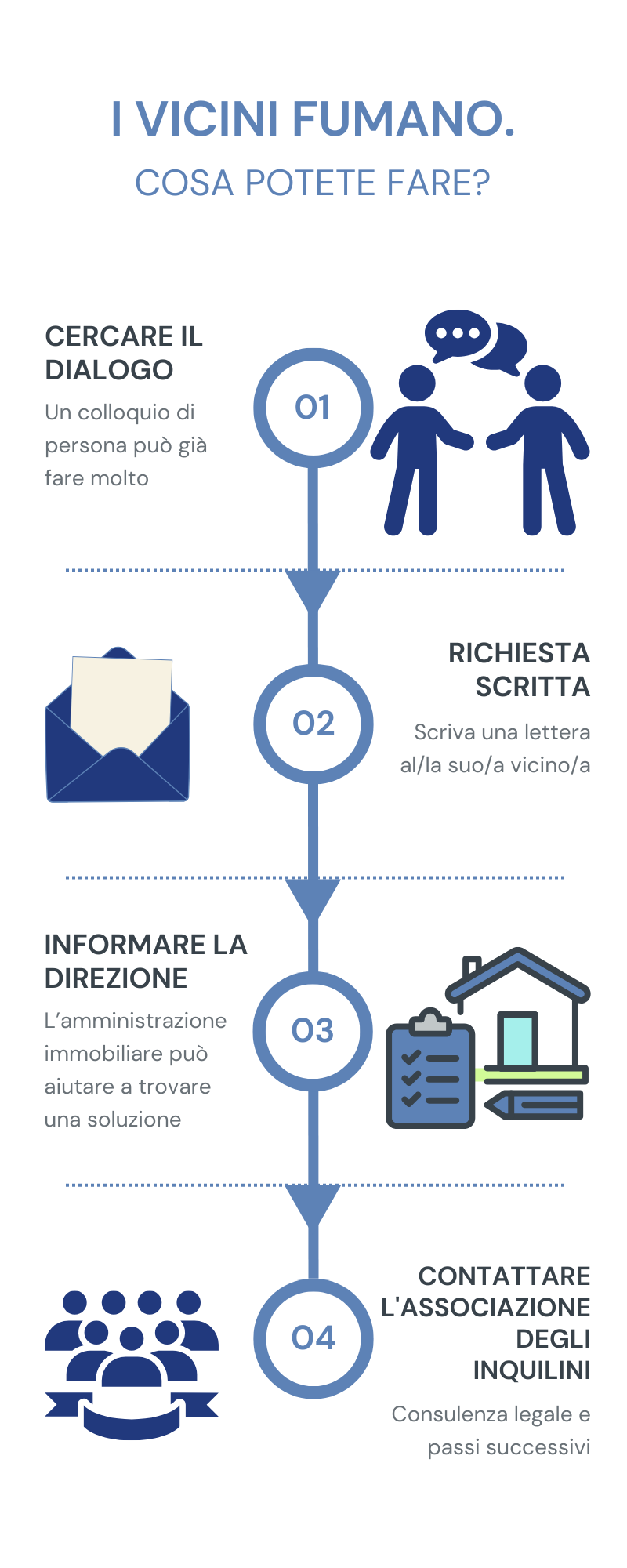 È possibile che il/la vostro/a vicino/a non si renda conto che il suo fumo entra nel vostro appartamento. Questa conversazione è l’occasione per condividere il problema e cercare insieme una soluzione.